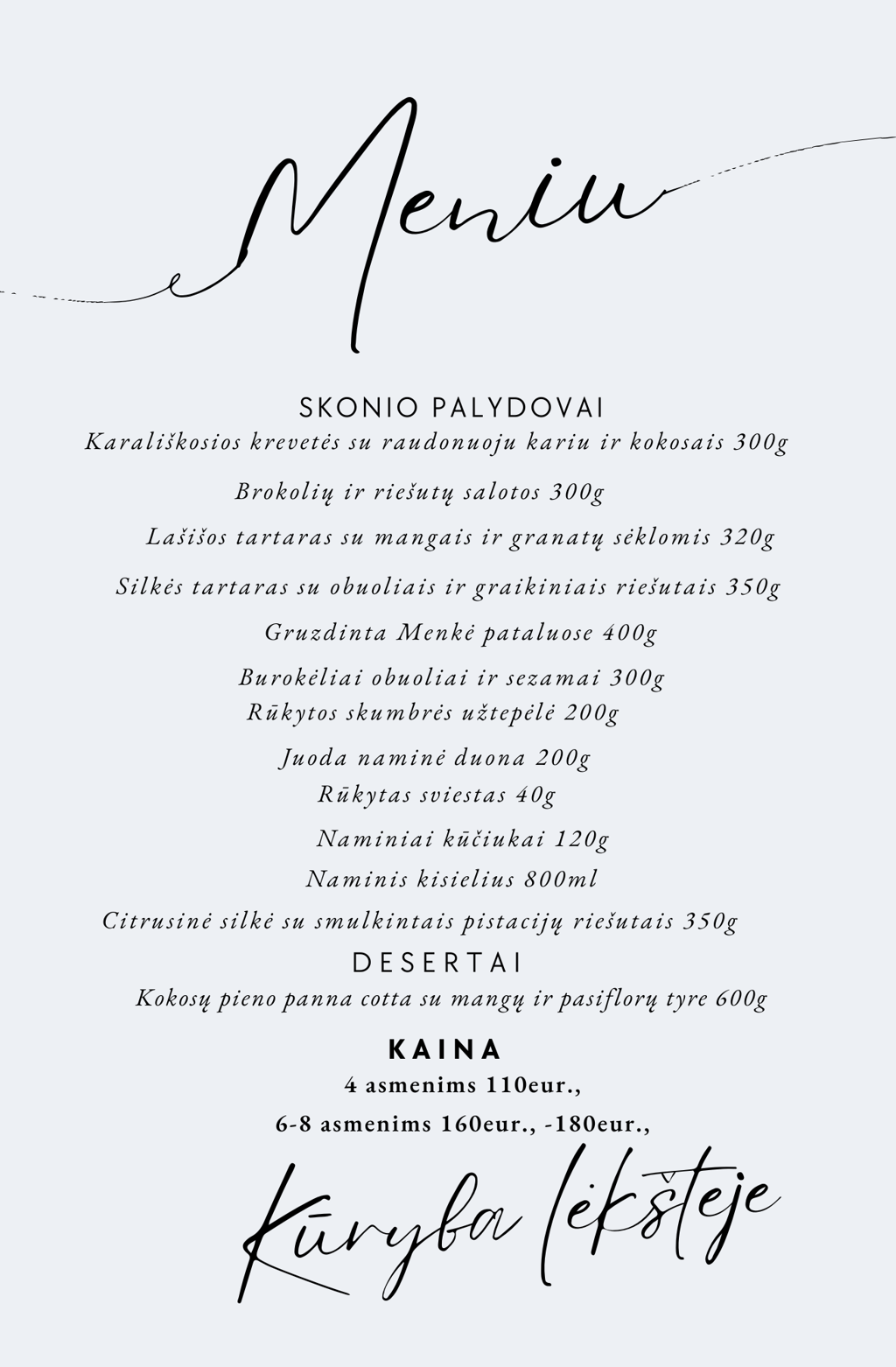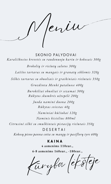 Mūsų meniu sukurtas taip, kad atitiktų visus šio ypatingo vakaro reikalavimus – 12 patiekalų su didesniu dėmesiu skiriant išskirtiniams užkandžiams ir desertams. Kiekvienas patiekalas gaminamas su meile, naudojant tik kokybiškiausius produktus.